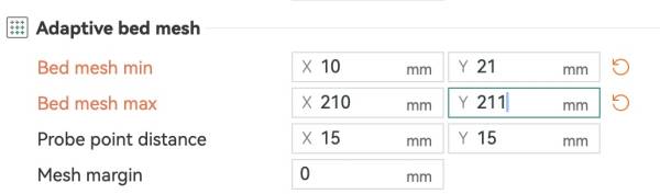 While the defaults (-99999,-99999 & 99999,99999) will specify the whole plate is probe-able, this isn't actually the case. If you find the printer tries to probe beyond the plate borders you just need to copy in your bed mesh boundaries to Orca's Printer settings, yet the defaults will work unless you're printing close to the ends of the bed.